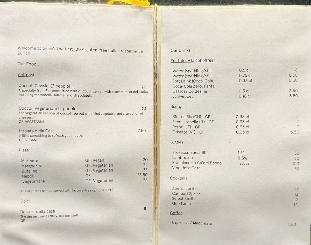 Grano - La Pizzeria 100% Gluten-free Menu